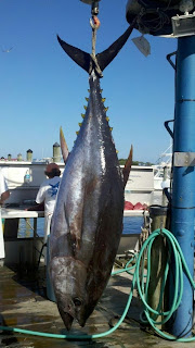 Just in time for the 26th Annual Tuna Tournament the big are joining the populations of yellow fin and blue fin that are hitting the docks at OCFC. High hook today goes to the “Blood Sweat & Tears” with Captain Jeremy Blunt who returned with a 209 pound big eye tuna (see below) as well as 9 yellow fin tuna. Another impressive big eye weighing in at 185 pounds came from Captain Jeremey Shandrowsk…i on the “Playmate” accompanied by 9 yellow fin tuna. After an overnighter the “Game On” with Captain Mike returned with their limit of blue fin tuna (2) a make, a yellow fin and a dolphin. Captain Dale Lisi on the “Foolish Pleasures” also had a great day today and returned with a nice sized Bluefin tuna as well. More tuna were seen off of the “Jade II” today with Captain Ed Kauffman who returned with a Bluefin, 4 yellow fin and a nice sized dolphin. Two white marlin were released today aboard the “Last Call” with Captain Franky Pettolina which is the first white marlin released from this marina this season! Congrats to Captain Franky. Aboard the “Luna-Sea” Captain Larry Dougherty returned with a nice sized big eye weighing in at 205 pounds and reported heavy tuna action today. Further inshore Captain Mark Sampson on the “Fish Finder” reports releasing a variety of species of sharks today during his trips. The “Bay Bee” with Captain Cale Layton also had a good day today with 2 keepers and throwbacks between all of his trips. More keeper flounder, two to be exact were seen on the “Get Sum” with Captain Nick Clemente along with crabs and clams between his trips. Overall the fishing is hot right now and the Tuna Tournament is this coming week. Weigh-Ins will be held daily between Friday July 12 and Sunday July 14, 2013 between 4:30- 7:30 here at the Ocean City Fishing Center! Come down and join us it’s great fun for the whole family!!!