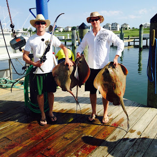 OFFSHORE: With a good number of the boats that left today staying out overnight for the big fish classic we don’t have too much to report for today. However, those that went fishing did have success. The “Spring Mix II” with Captain Chris returned to report 2 white releases and a blue marlin release. On the “Playmate” with Captain Chad Meeks at the helm the crew released 2 white marlin. Both the “Wrecker” with Captain Jeremy Blunt and “Game Over” with Captain Steve Pfeiffer released a white marlin today. With a focus shifting to marlin don’t be fooled boats are still catching tuna! The “Game Changer” with Captian Fred Husman returned with a yellow fin and reported releasing several others today. Captain Butch on the “Jade II” had a smilar report with a yellow fin, and a handful of dolphin today. Captain Ron Taylor on the “Playtime” weighed in an impressive wahoo today at 72 pounds. (see photo). We have about 6-7 boats who are fishing through the night and we hope to hear great reports when the return tomorrow! INSHORE: The “Bay Bee” with Captain Cale Layton had throwbacks across both trips today. On the “OC Guide Service” Captain John Prather had a busy day at the wrecks in the morning returning with 4 keeper flounder after weeding through ample throwbacks. During his afternoon trip the crew focused their attention to bowfishing and shot a few rays. (see photo) On the “Ivy Sea” Captain Bill Kelly ventured to the wrecks just off the coast and it was the right choice. During his 5 hour trip the crew had 5 keeper flounder, and plenty of throwbacks. His afternoon was filled with flounder, rockfish, sea robin, and many other species of fish but unfortunately no keepers. On the “Get Sum” Captain Nick Clemente had 3 keepers in the morning while fishing in bay and throwbacks for the remainder of his trips. Right now the fishing is begining to pick back up! We hope to have a busy morning full big fish with the number of boats who are fishing overnight! Check back tomorrow to see what they caught. Now is the time to book your trip with Ocean City’s Premier Charter fleet don’t miss your opportunity call us today! If you have any questions or would like to make a reservation please feel free to stop on by or give us a call we would love to hear from you!!! (410) 213 1121