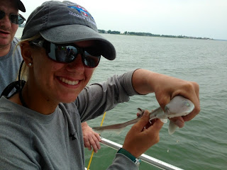As captains prepare for the upcoming White Marlin Open not as many boats went fishing today, however many are available and willing to take trips as the fishing is hot! Captain Dale Lisi on the “Foolish Pleasures” returned from his day at the canyons with 14 nice sized dolphin. Aboard the “Last Call” Captain Franky Pettolina led his crew to some great sized yellowfin. The crew landed a total of 3 yellow fin. The tilefish king himself Captain Ron Callis was at the helm of the “Reel Addiction” today and did not disappoint. The crew landed 6 golden tilefish, 10 blueline tilefish, 10 seabass, 2 wreck fish and a snowy grouper. Captain Jeremy Blunt on the “Blood, Sweat, & Tears also had a good day of wreck fishing returning with plenty of seabass and blueline tilefish. Captain Nick Clemente on the “Get Sum” had a good morning filled with crabs and clams. The tide was definitely with the afternoon trips today and Captain Nick proved that with a keeper and throwbacks on his four hour trip and 4 keepers among throwbacks on his evening trip (photo) The “Bay Bee” also had a busy afternoon after a morning of throwbacks. The “Bay Bee” had a total of 4 keepers this afternoon and evening. Also the “Bay Bee” landed an unusual catch with a smooth dogfish shark (photo). Overall the fishing is great and Captains are preparing for a busy few weeks filled with tournaments and hopefully a good amount of fish. If you have any questions or would like to make a reservation please feel free to give us a call or stop on in we would love to hear from you!!!
