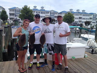OFFSHORE: It was not a terribly busy day offshore today, many of our boats are preparing for the 28th annual Tuna Tournament which begins this Friday! But a few of our boats still went prospecting! Captain Rob Skillman on the “Moore Bills” fished inshore catching 2 blue fins, and then went to the hot dog to find some yellow fins returning with2 and releasing 3 others . On the “Game On” Captain Jon Yost reported 2 yellow fin, 3 gaffer dolphin and releasing several other tuna today. The “Muff Diver” with Captain Wayne Bradford took a shorter trip today leaving late and returning early but not without fish; they reported a blue fin tuna and a handful of decent sized dolphin. After a few good days of big eye fishing we are hoping that the tuna will stick around for the weekend! INSHORE: Today flounder fishing seemed to favor the afternoon tide, with a majority of our bay boats catching more keepers in the afternoon. Captain Cale Layton on the “Bay Bee” had a keeper in the morning and 3 in the afternoon along with numerous throwbacks. On “OC Guide Service” Captain John Prather went sharking in the morning and caught a keeper, his afternoon he had 3 keepers and plenty of throwbacks. Captain Nick Clemente on the “Get Sum” and “Ivy Sea” had throwbacks in the morning and 3 keepers in the afternoon, 2 keepers in the evening with no shortage of smiles and happy customers. (see photo) The flounder fishing seems to be improving! Right now our staff is preparing for the 28th annual Tuna Tournament, held here at the Ocean City Fishing center. Weigh-Ins will be held daily between 4:30-7:30 pm on Friday & Saturday and 4:30-7:00 on Sunday. With a mixture of big eye, and blue fin and plenty of yellow fin the water we anticipate a great tournament full of big fish! Don’t miss the excitement and join us for weigh-ins! If you have any questions or would like to make a reservation please feel free to stop on by or give us a call we would love to hear from you!!! (410) 213 1121